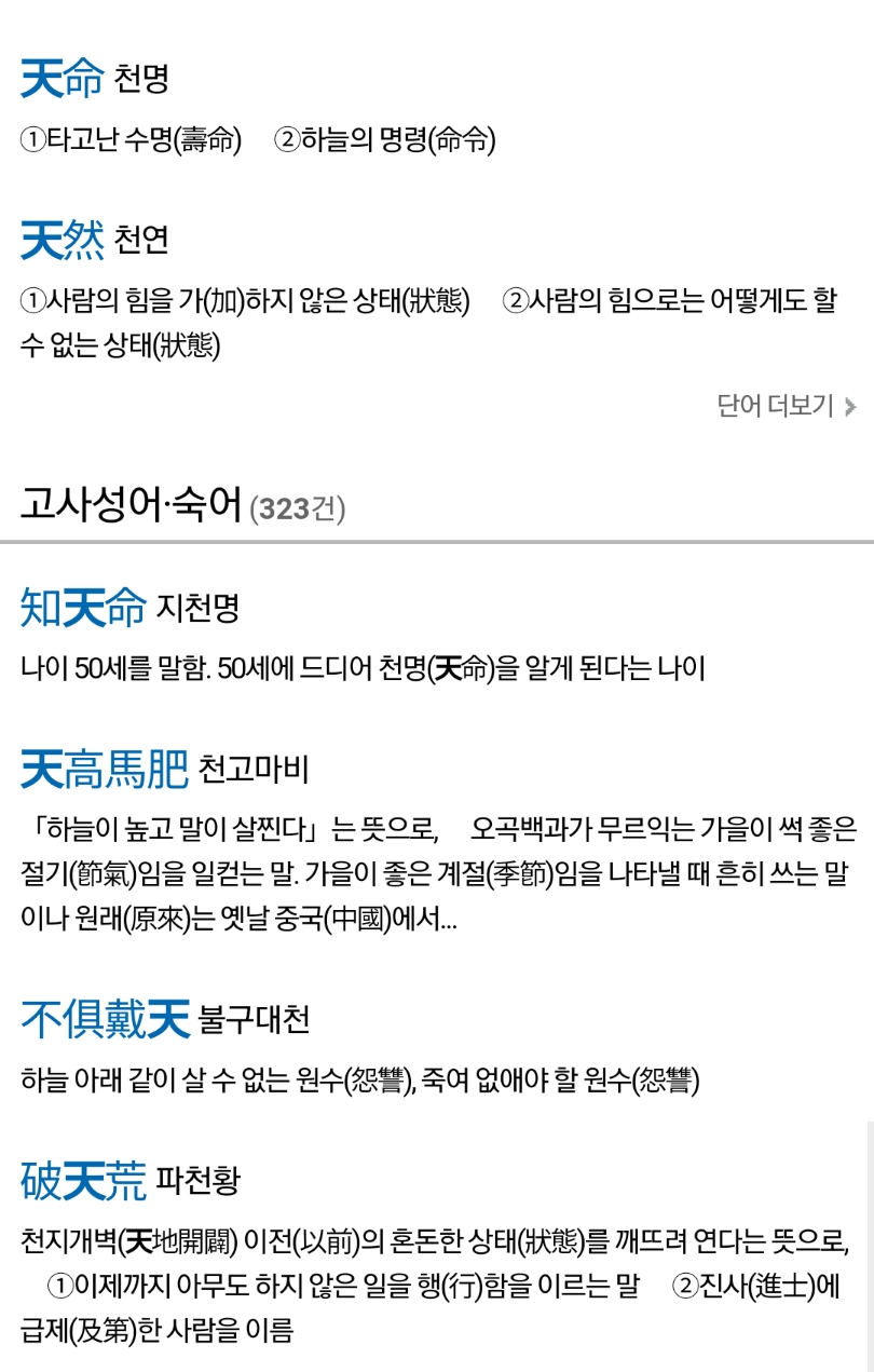 다음 화면으로 넘어왔습니다. 하늘천의 한자의 부수와 획수, 하늘 천자가 들어간 단어, 고사성어, 숙어가 화면에 나타납니다. 하늘 천자가 들어가는 고사성어, 숙어에는 지천명(나이 50세를 말함, 50세에 드디어 천명을 알게 된다는 나이), 천고마비(하늘이 높고 말이 살찐다- 는 뜻으로, 오곡백과가 무르익는 가을이 썩 좋은 절기임을 일컫는 말) 이렇게 자세하게 나타납니다.