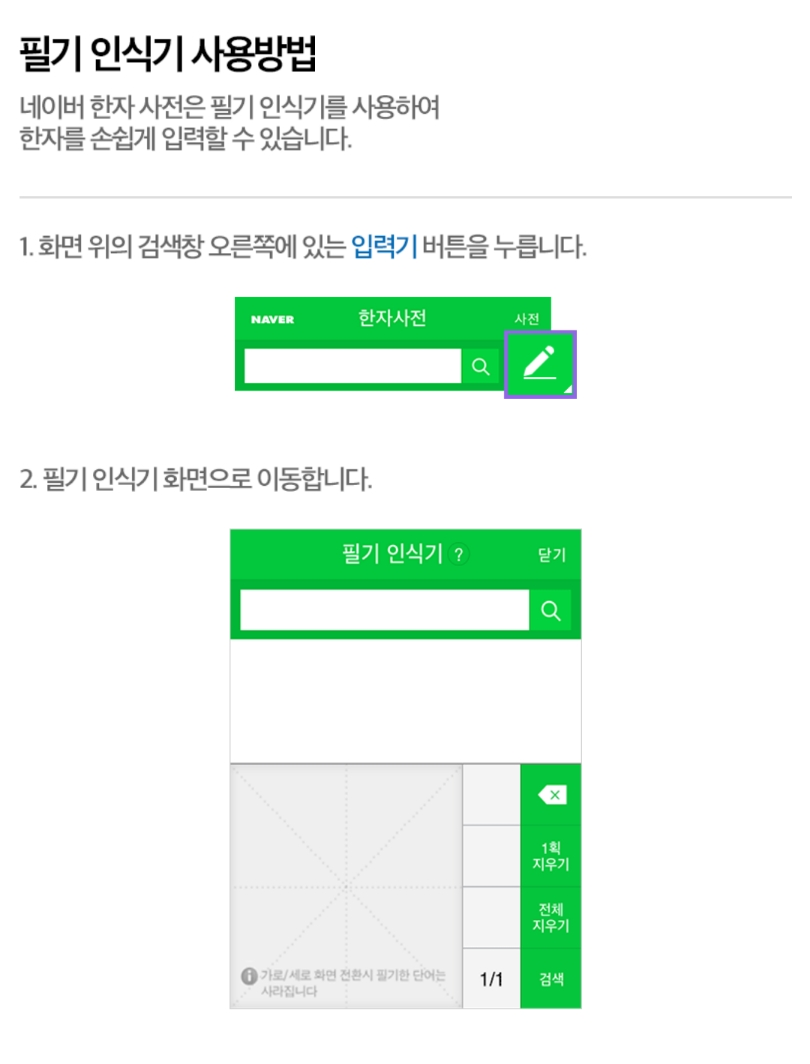 네이버 한자 필기입력기는 녹색창에서 "네이버 한자사전"이라고 검색해줍니다.