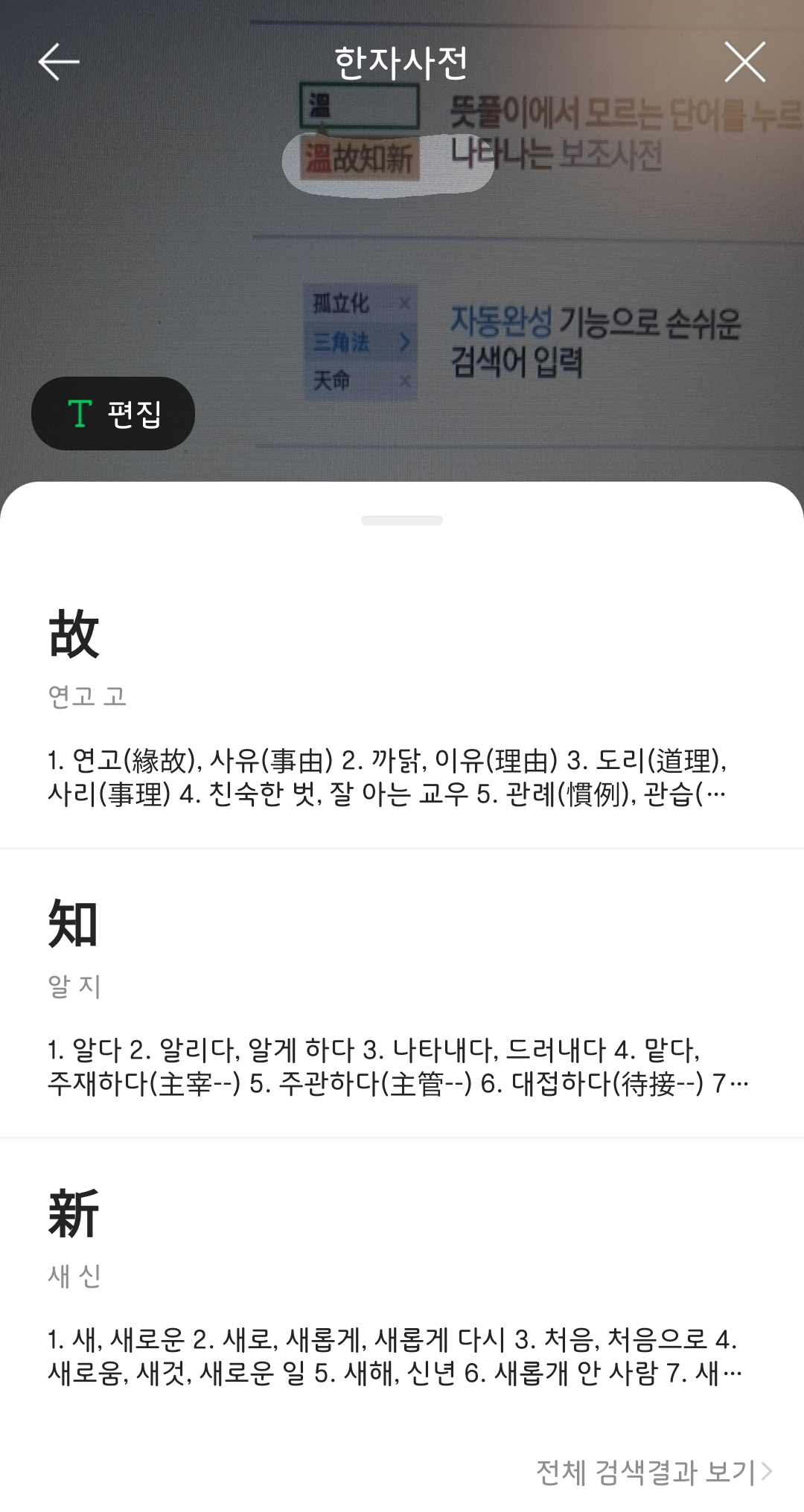 사진으로 한자를 검색할 때는 알고 싶은 단어를 문질러서 검색을 할 수 있습니다.