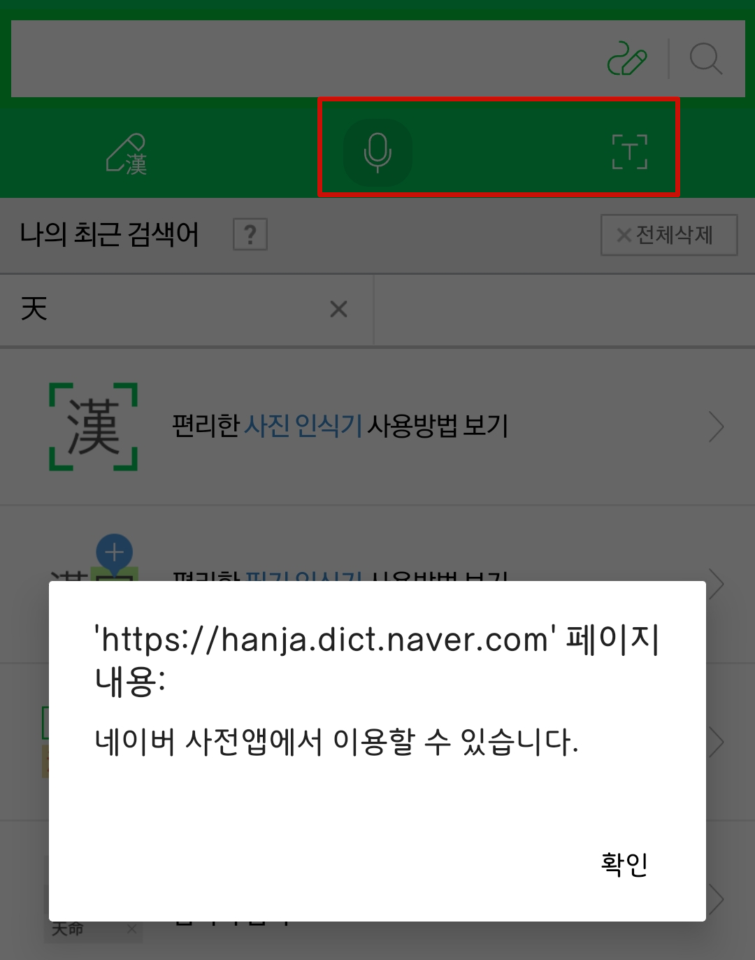 네이버 한자 필기입력기에는 음성으로 찾는 방법과 사진으로 찾는 방법이 더 있습니다. 이 방법을 사용하려면 네이버 사전앱을 설치하시면 됩니다.
