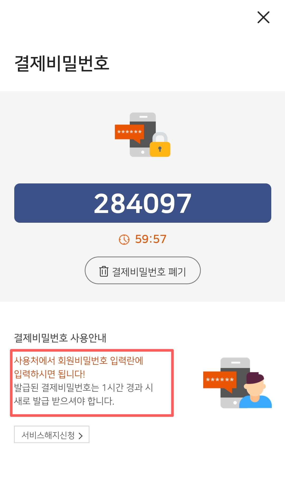 오른쪽은 해피머니 결제 비밀번호를 받은 모습입니다. 발급된 결제 비밀번호는 1시간 경과 시 새로 발급받으셔야 합니다.