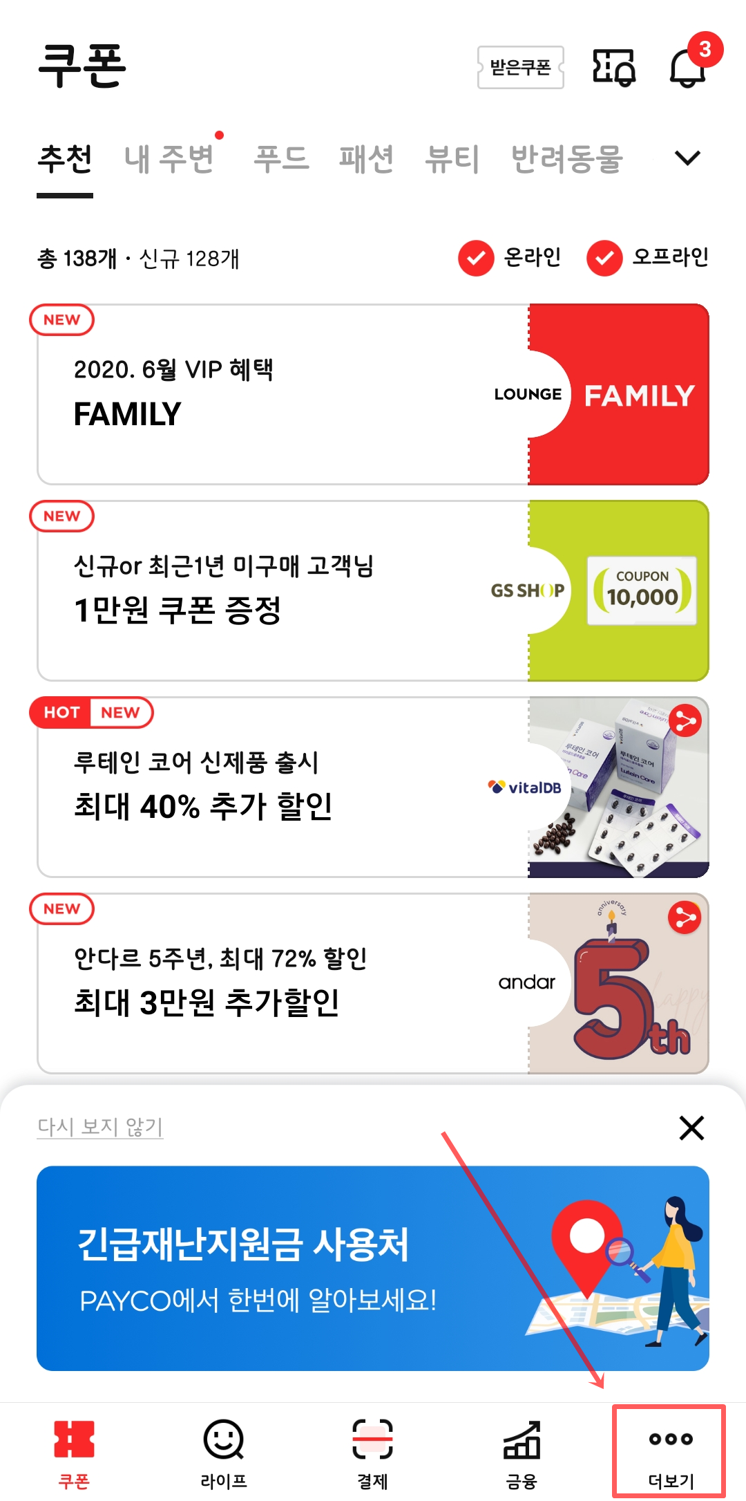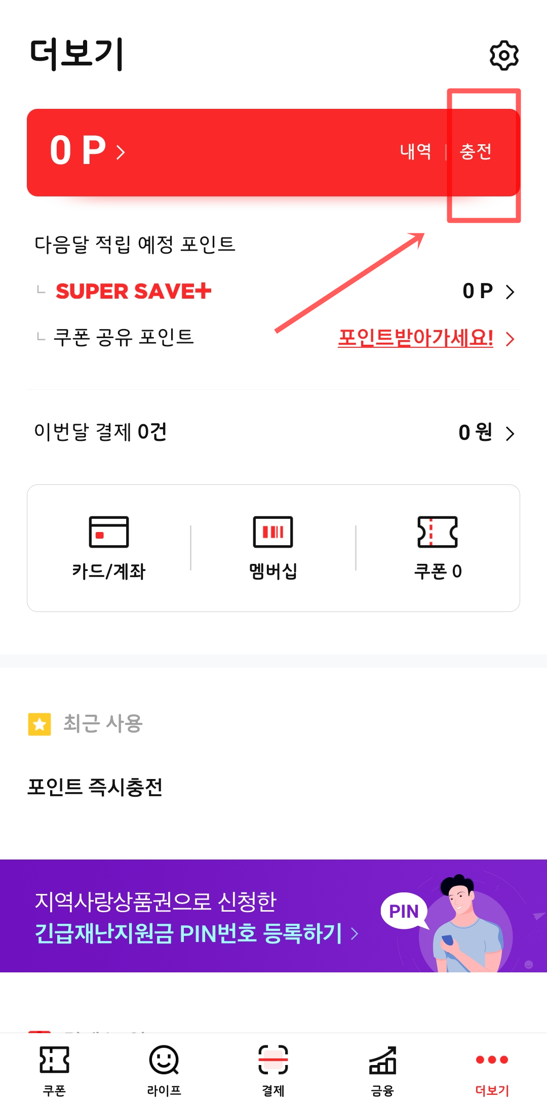 우선 페이코의 메인 화면에서 "더보기"를 클릭합니다. 페이코 포인트 부분에 "충천"을 클릭해줍니다.
