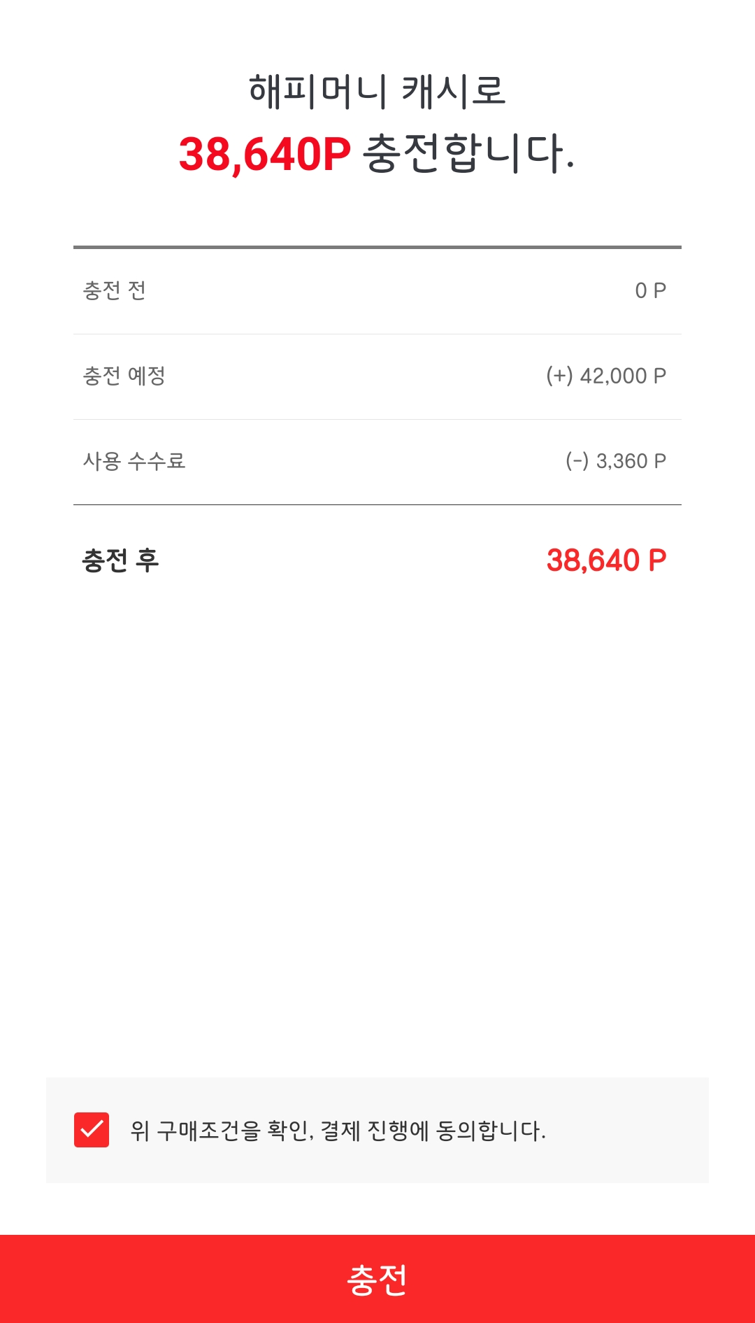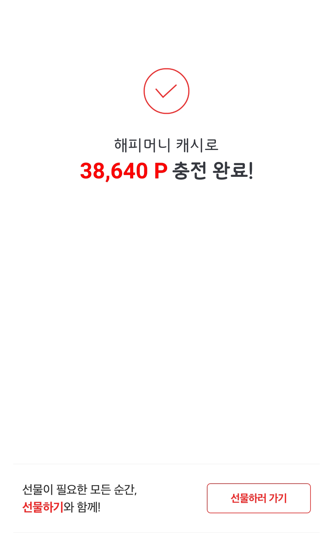 "결제 완료"를 누르면 해피머니 캐시로 충전이 완료됩니다.