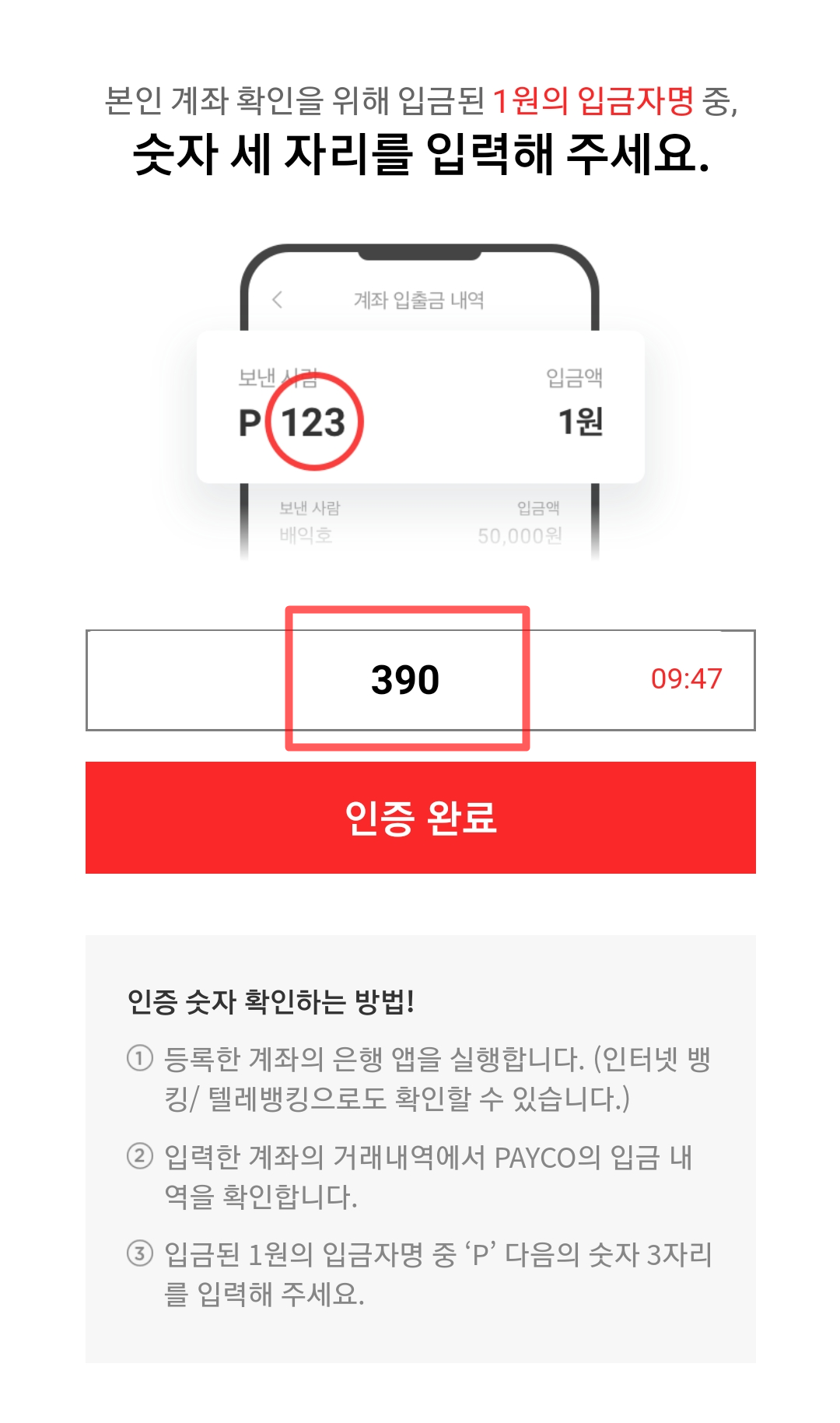 선택한 은행계좌로 1원이 입금되면서 Pxxx로 입금이 되는데 xxx부분은 숫자로 입금되어서 그 숫자를 입력해주면 됩니다.