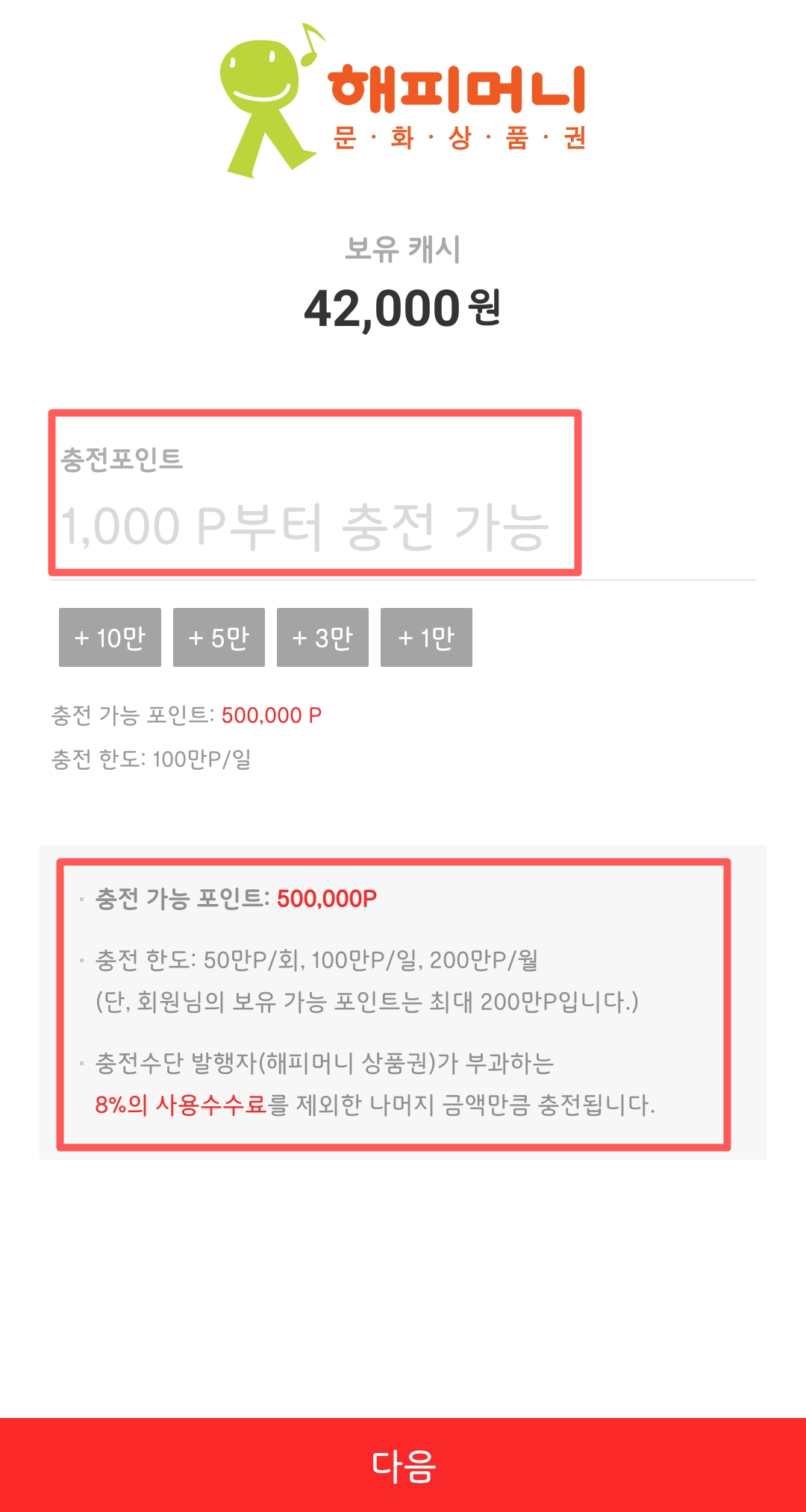 해피머니 상품권은 1000P부터 충전이 가능합니다. 충전은 1회 500,000 P 그리고 일일 충전 한도는 1,000,000 P입니다. 한 달에 최대 2,000,000 P까지 충전이 가능합니다. 42,000P를 충전해보겠습니다.