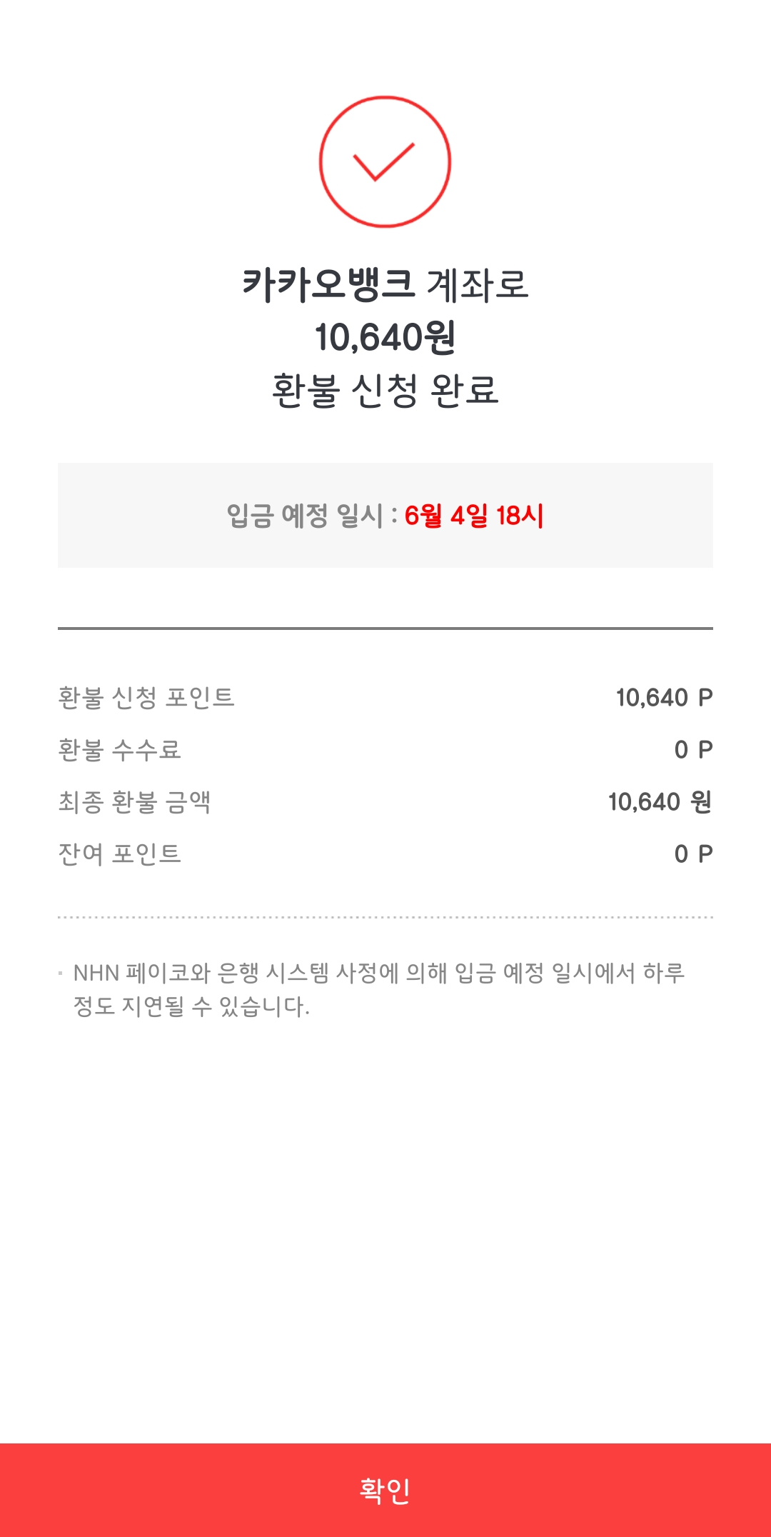 환불하기를 클릭해서 페이코 환불을 모두 마쳤습니다. 13시 정도에 신청을 완료했고, 입금예정은 다음날 18시 정도로 나타났습니다.