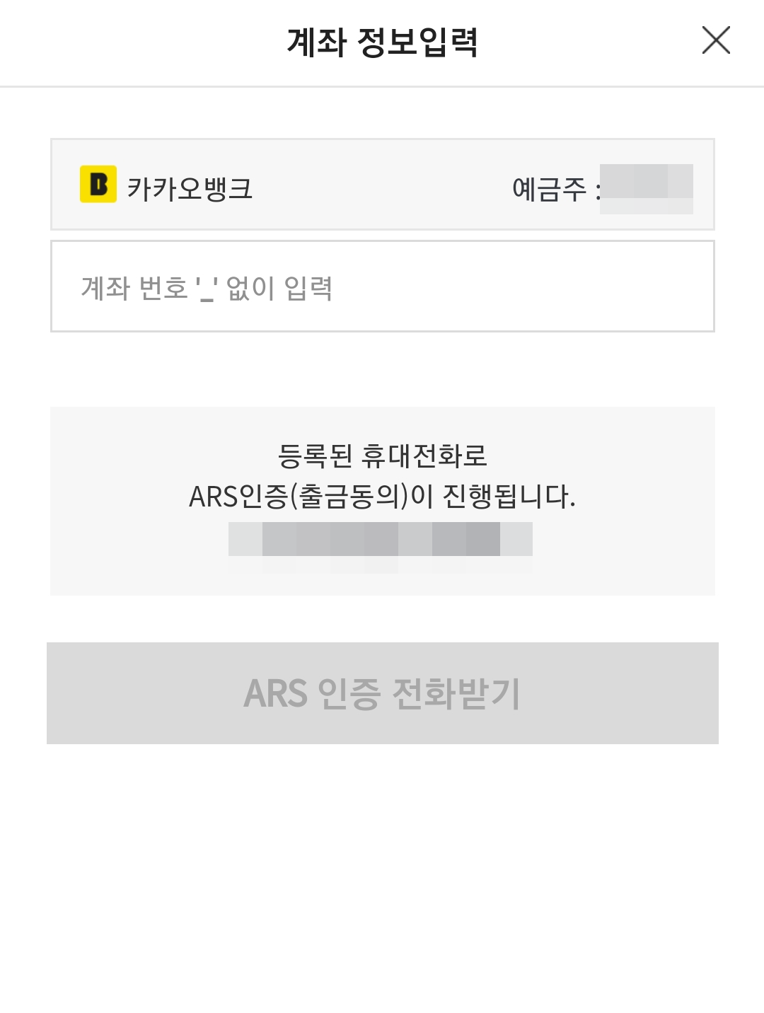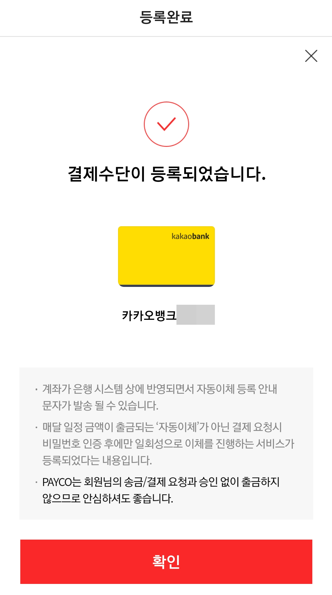 이렇게 카카오뱅크 계좌가 등록이 되었습니다. 이제 페이코 환불을 닫을 계좌 등록이 완료되었습니다.