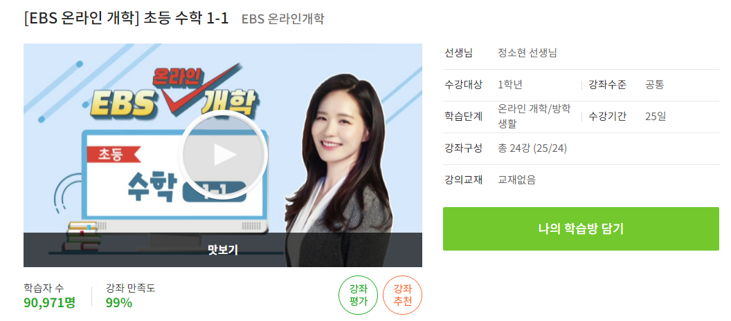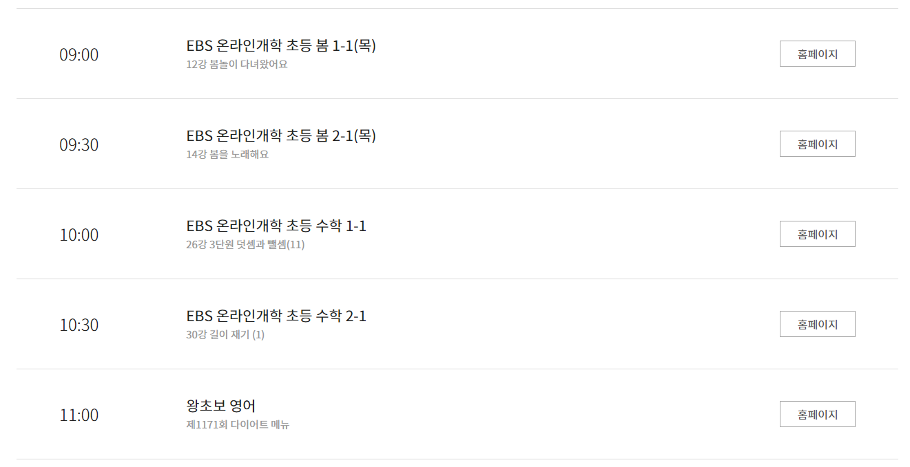9시부터 EBS 온라인개학 초등학교 1~2학년의 방송 편성표를 알아볼 수 있습니다.