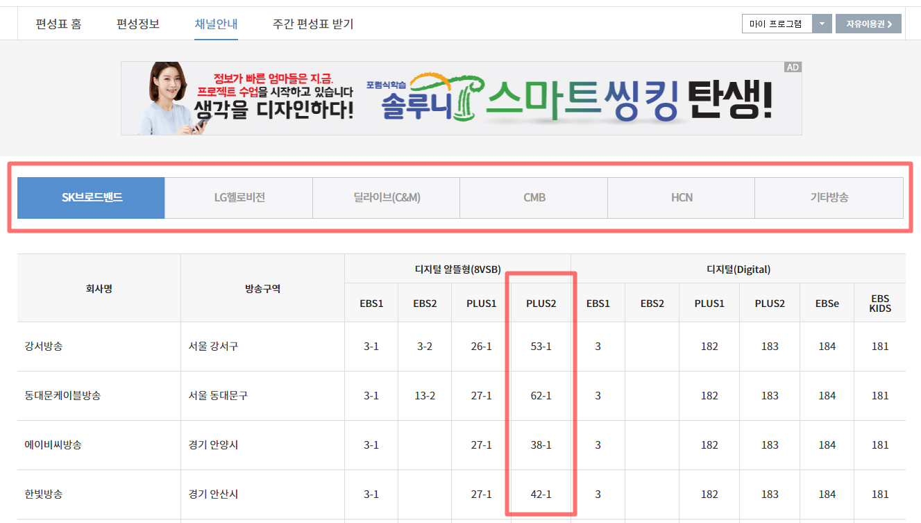 집에 설치된 방송사 채널을 먼저 선택하고 EBS 플러스2 채널의 번호를 알아보면 됩니다. 이번에는 EBS 플러스2 편성표 보는 방법을 알아봤습니다. 감사합니다.