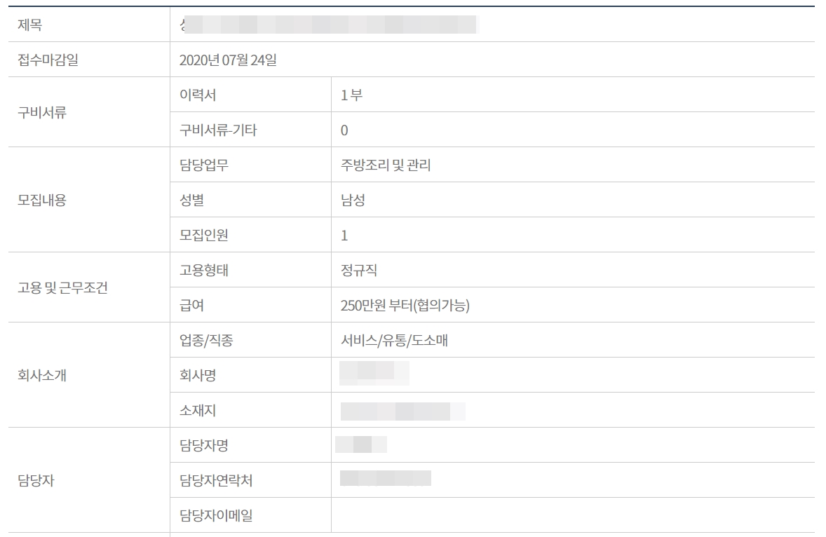 모집내용을 클릭을 해서 보면 접수마감일, 구비서류, 모집내용, 고용및 근무조건, 회사 소개, 담당자, 복리후생 등을 확인할 수 있습니다.