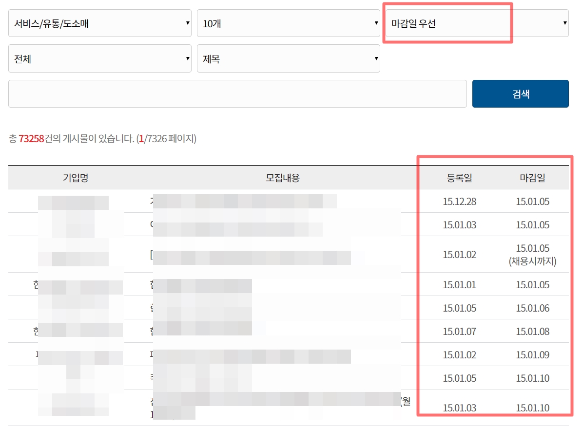 정렬 기준중에 등록일 우선, 마감일 우선이 있는데 마감일 우선으로 정렬을 해서 검색을 하면 날짜 정렬이 이상하게 되는 것 같습니다. 처음에 설정이 되어있는 등록일 우선으로 검색하는 걸 추천드립니다.