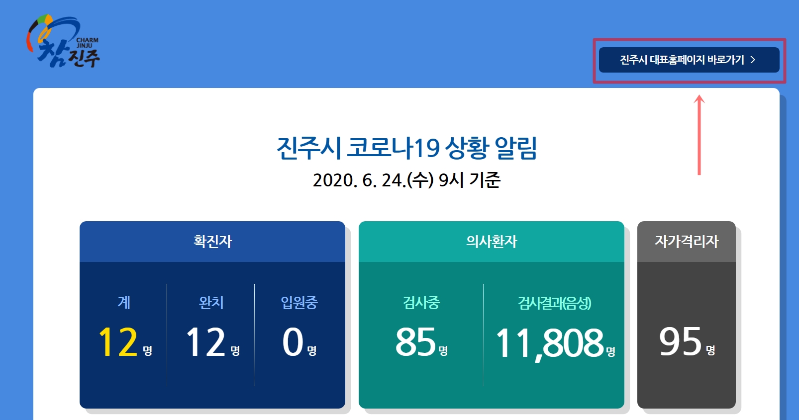 지금은 코로나로 인해서 진주시청 홈페이지에 접속 전에 진주시의 코로나19 상황 알림이 먼저 나옵니다. 상단의 지주시 대표 홈페이지 바로가기를 클릭해서 접속해줍니다.