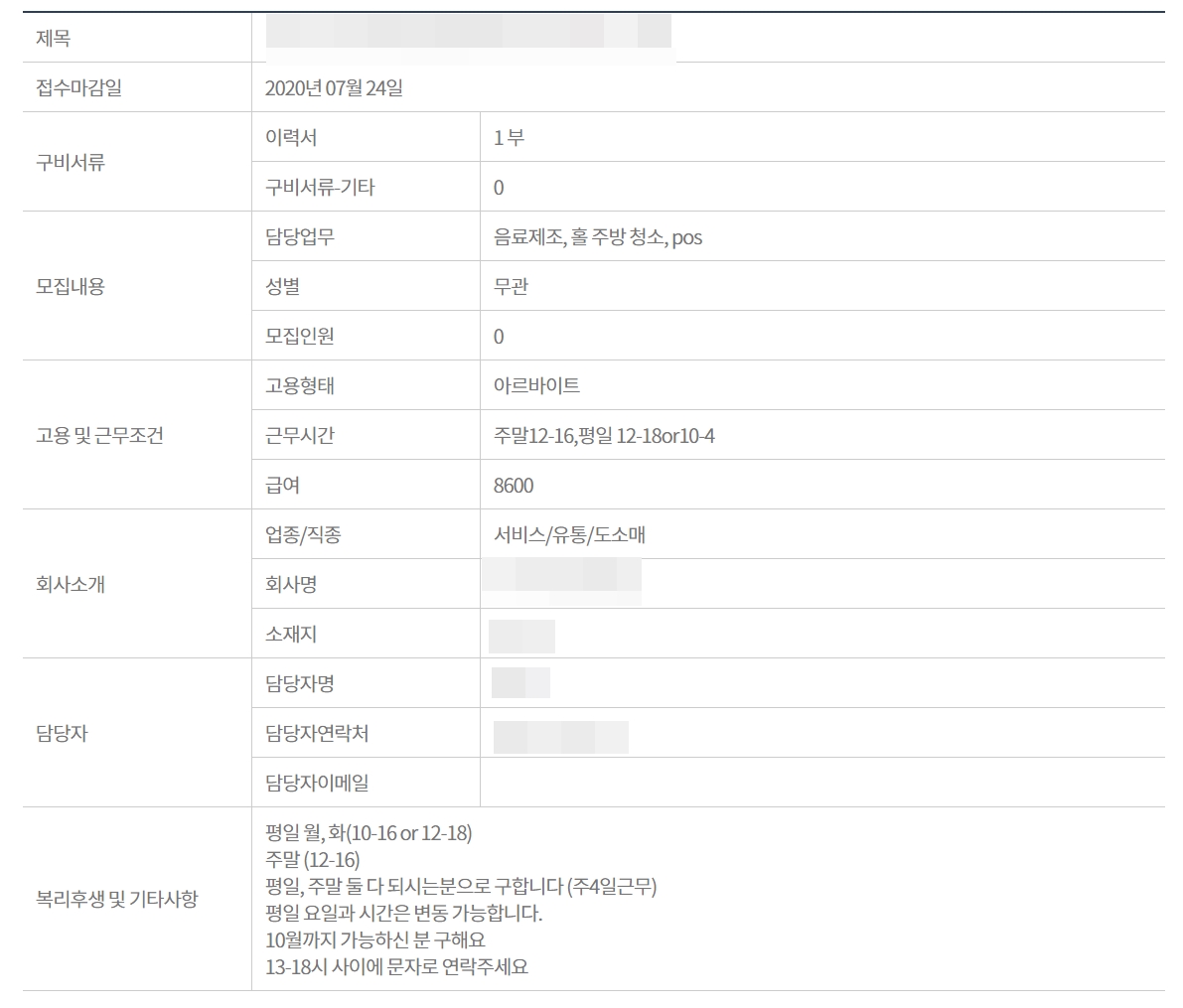 아르바이트 역시 접수마감일, 구비서류, 모집내용, 고용 및 근무조건, 회사조개, 담당자, 복리후생에 나용을 파악해 보실 수 있습니다.