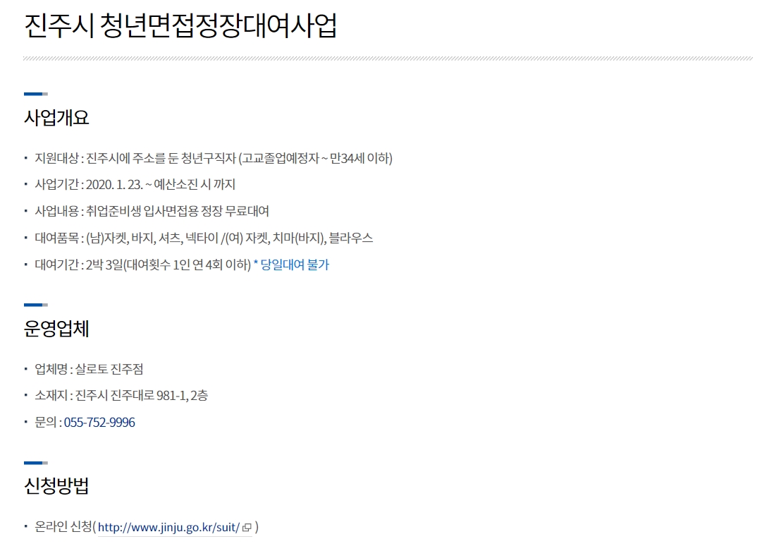 취업준비생의 입사면접용 정장을 무료로 대여해주는 사업으로 지원대상은 진주시에 주소를 둔 청년 구직자(고교 졸업예정자~만 34세 이하)입니다.