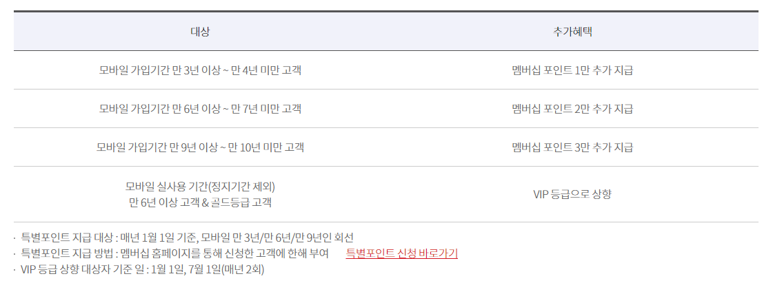 모바일 가입자 대상 장기 특별 포인트(해당년도 12월 31일까지 제공)