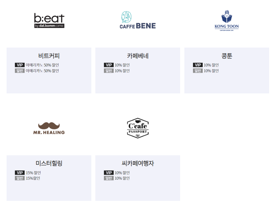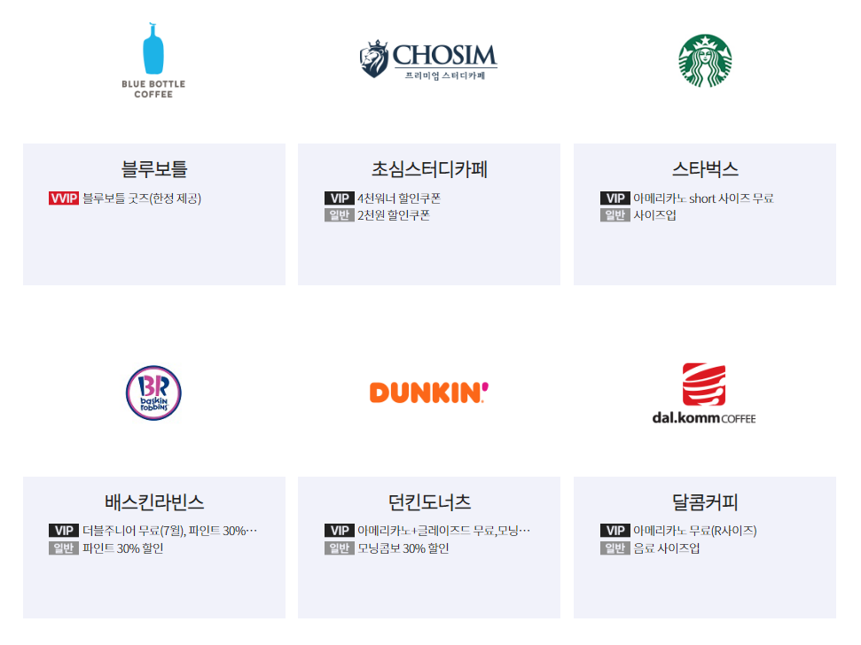 카페는 스타벅스, 초심스터디카페, 배스킨라빈스, 던킨도너츠 등 KT 포인트 사용처가 11개가 있습니다.