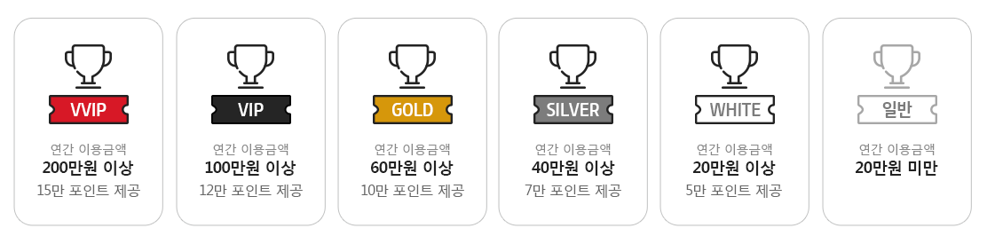 KT 포인트 멤버십은 일반에서부터 VVIP까지 6단계로 구성되어있습니다.
