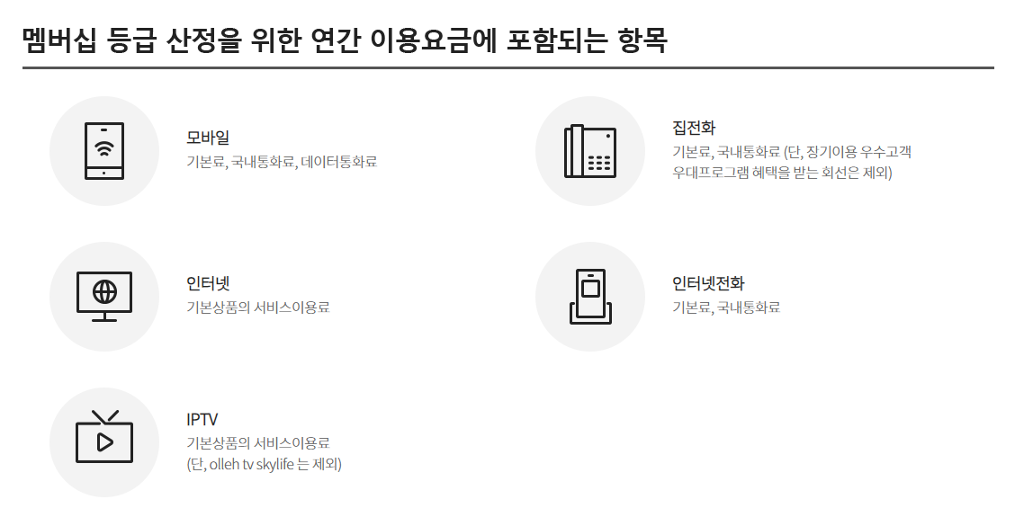 멤버십 등급 산정에는 모바일, 집전화, 인터넷, 인터넷전화, IPTV의 이용요금이 포함됩니다.