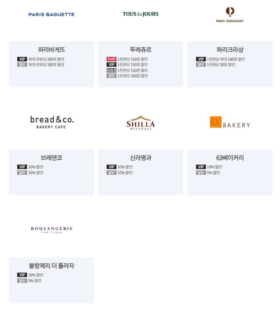 베이커리는 바리바게뜨, 뚜레쥬르, 파리크라상, 브레댄코 등 KT 포인트 사용처가 7개가 있습니다.