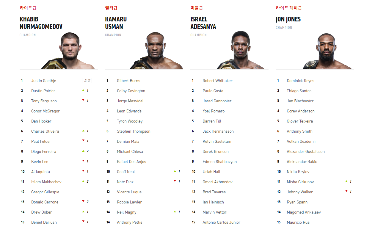 라이트급에는 하빕 누르마고메도프 선수, 웰터급에는 카마루 우스만 선수, 미들급에는 이스라엘 아데산야 선수, 라이트헤비급에는 존 존스 선수가 챔피언 자리에 있습니다.