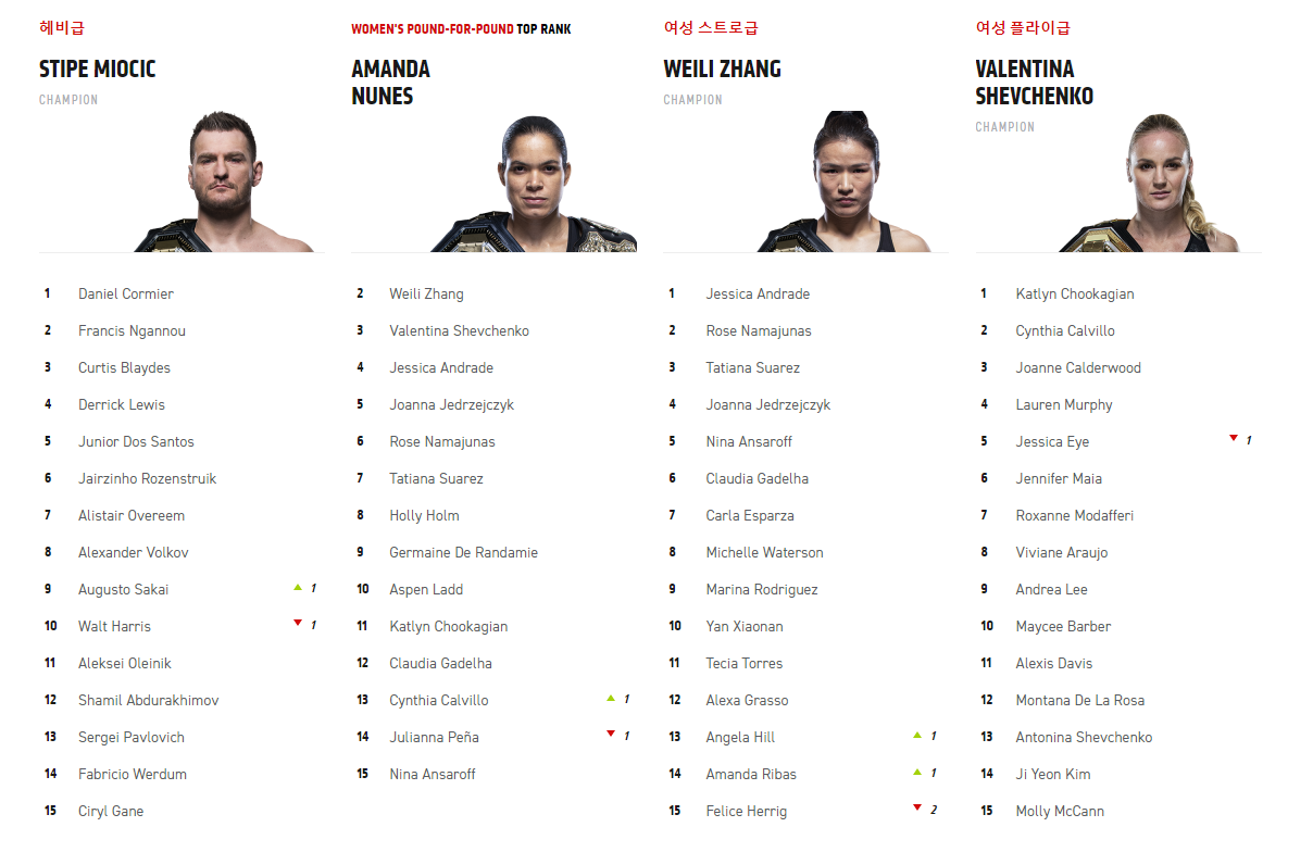 순서대로 헤비급에는 스티페 미오치치 선수, 밴텀급&페더급에는 아만다 누네스 선수, 스트로급에는 장 웨일리 선수, 플라이급에는 발렌티나 셰브첸코 선수가 챔피언 자리에 있습니다.