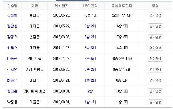 UFC 선수들의 실시간 랭킹을 바로 확인하실 수 있습니다. 그리고 선수 이름을 클릭하면 해당 선수의 갤러리로 들어가서 해당 사진을 볼 수 있습니다.