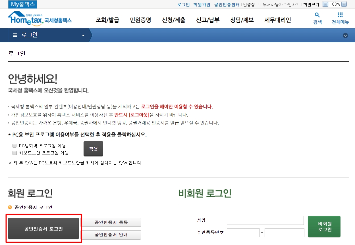 여기 "공인인증서 로그인"을 클릭합니다.! (준비물로 공인인증서는 필수입니다.!)