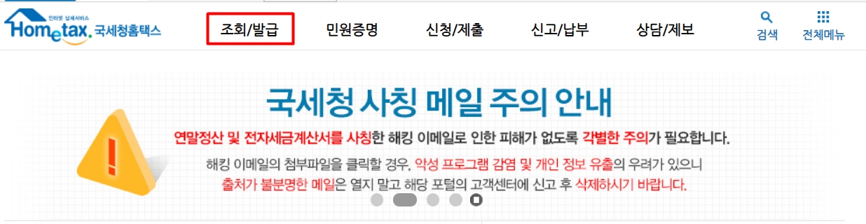 다시 홈텍스의 첫화면으로 돌아와서 "조회/발급" 버튼을 클릭합니다.
