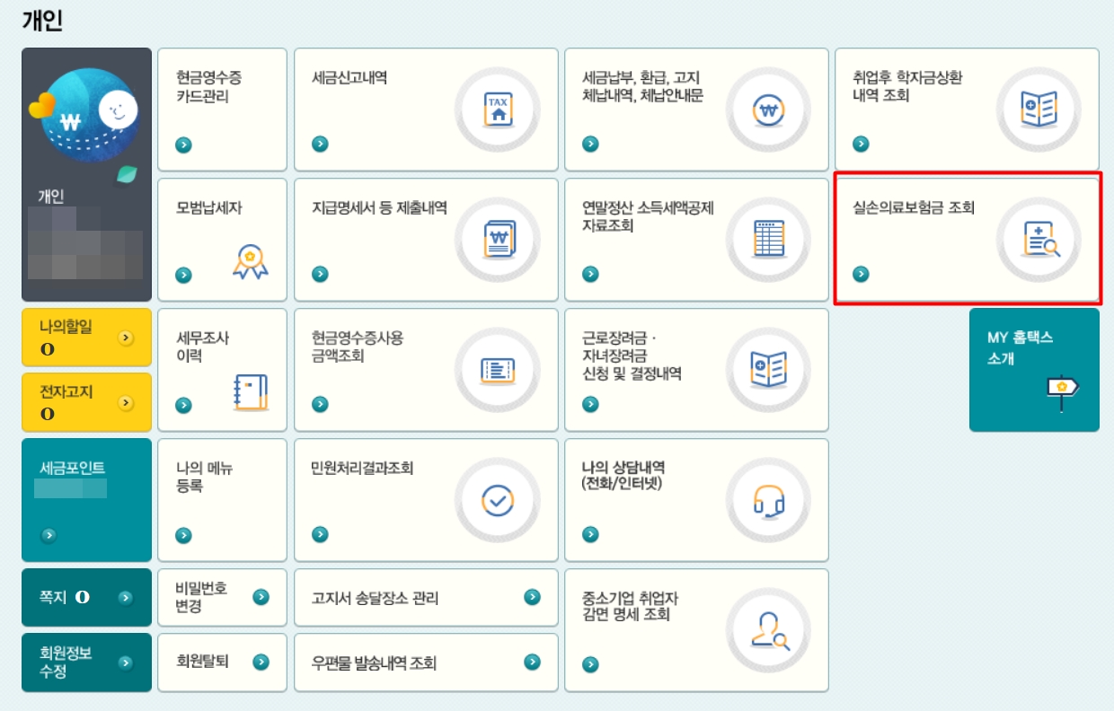 오른쪽 편의 "실손의료보험금 조회"를 클릭해줍니다.