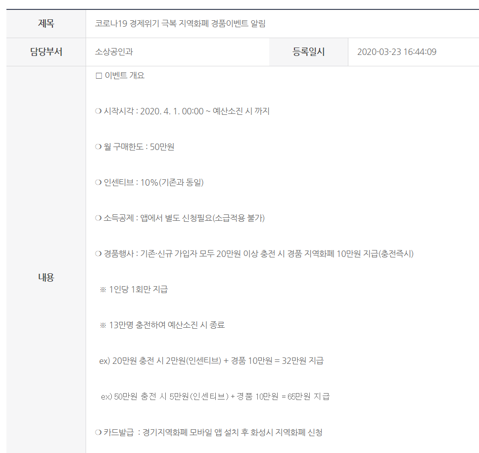 코로나 19 경제위기 극복 지역화폐 경품 이벤트입니다.