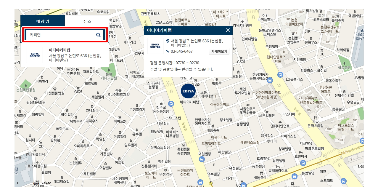그럼 이렇게 맵이 나오는데 이곳에서 매장명이나 주소로 검색을 하시면 됩니다. 아무래도 주소를 정확히 알고 계시는 분들은 없으실 겁니다. 여기는 "xx동" 이런 식으로 넣어주면 검색이 됩니다.