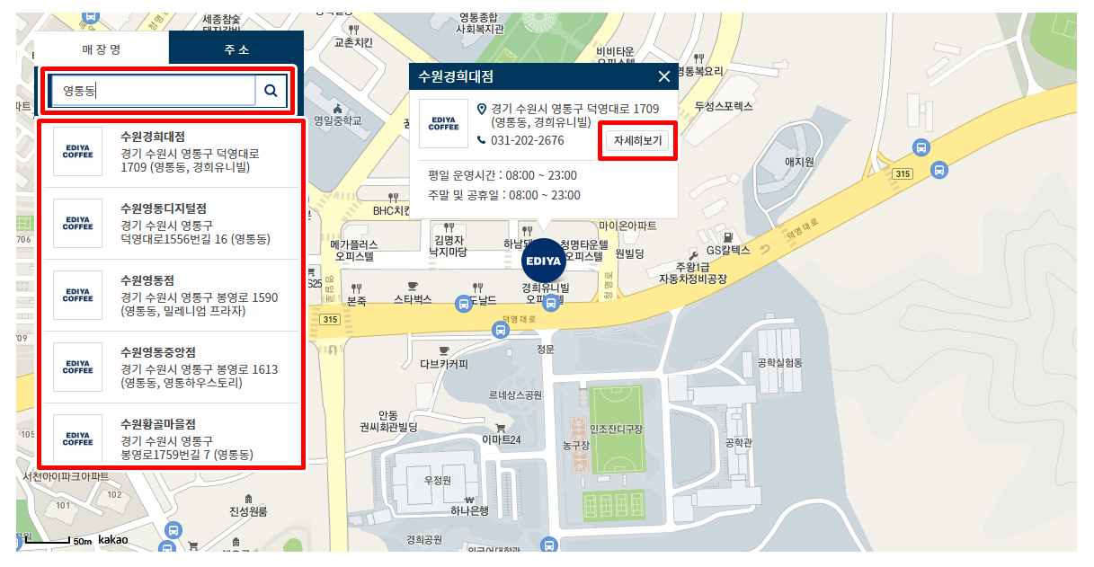 원하시는 점을 선택하면 맵위에 "수원경희대점" 이라고 나오면서 "평일 운영시간"과 "주말 및 공휴일" 운영시간이 나와있습니다. 여기서 더 자세한 정보를 얻고 싶으시면 "자세히보기"를 클릭해줍니다.