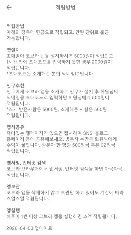 | 스마트폰 부업 코브라 브라우저 앱 설치 방법 및 꿀팁 (0) | 2020.04.04 |