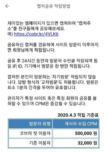 그럼 여기서 일회성인 앱 설치 적립이나 신규 가입자를 만들어서 적립금을 모으는 방법보다는 웹페이지를 캡처공유를 하는 방법을 주목해봐야 합니다.