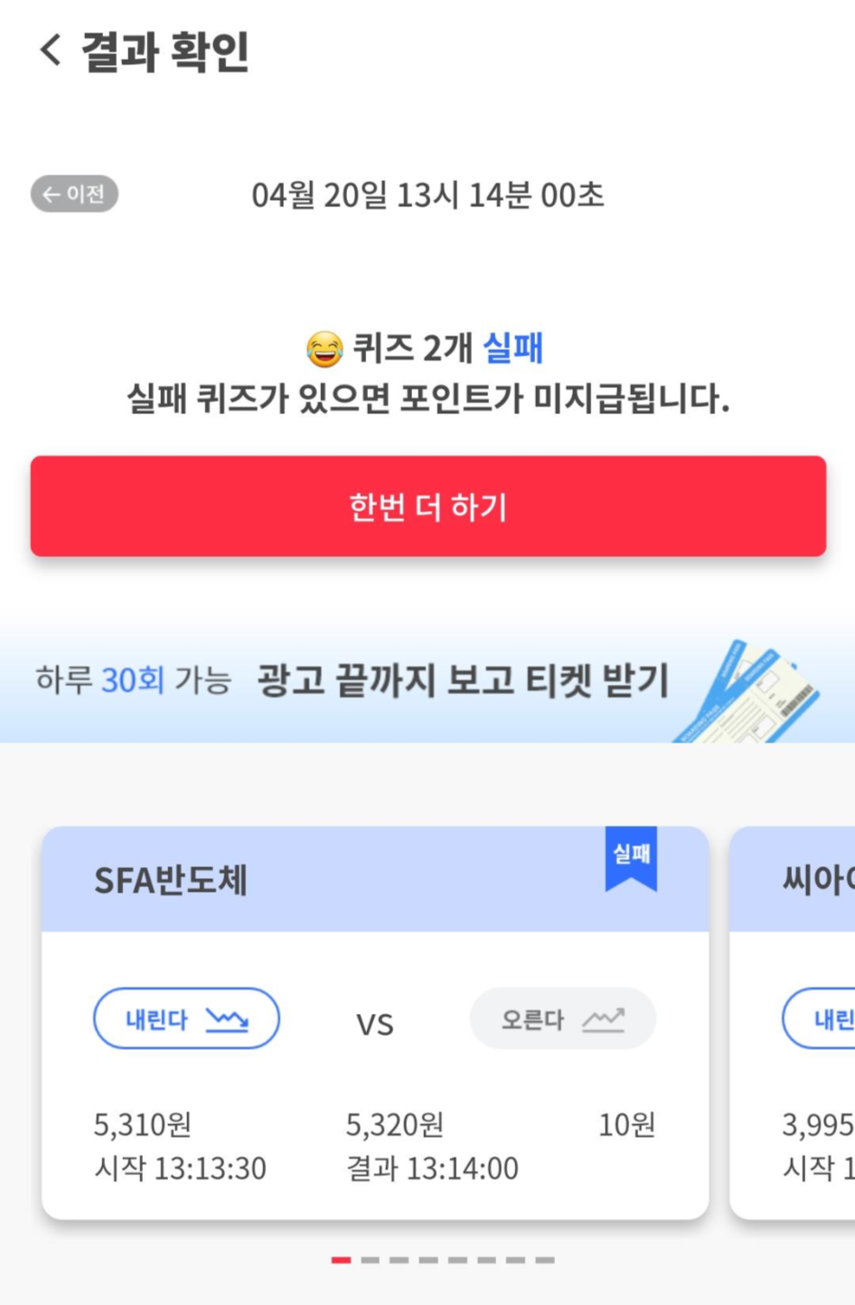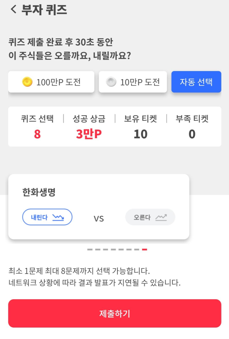 주식들이 30초 뒤에 오를지, 내릴지를 선택해줍니다. 어떻게 될지 모를 땐 "자동선택"을 하셔도 됩니다.