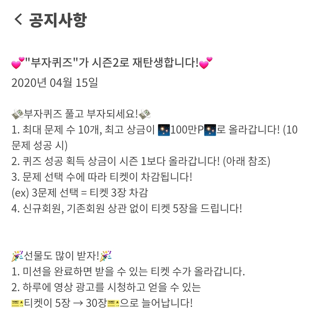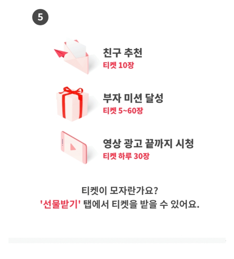 친구 추천을 하면 10장의 티켓을 받을 수 있습니다. 부자 미션 달성시 5~60장 그리고 영상 광고를 끝까지 시청하면 하루 30장의 티켓을 더 받을 수 있습니다.