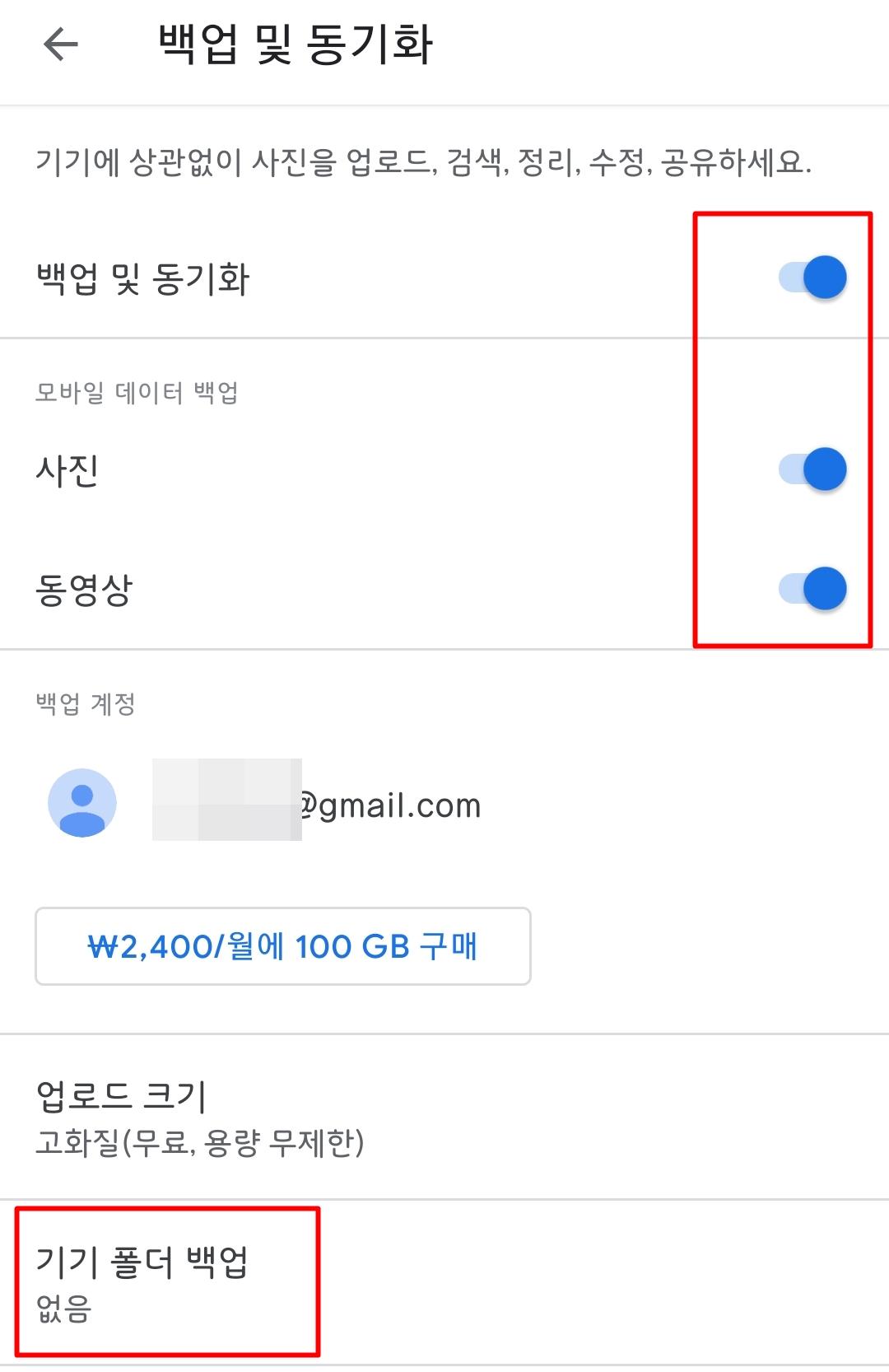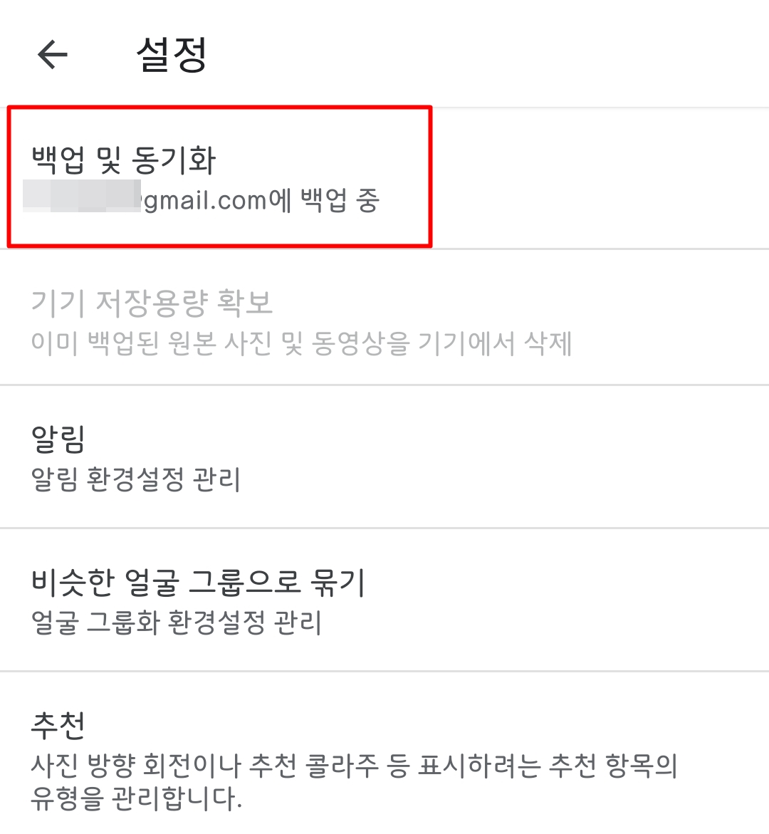 설정에 들어가서 "백업 및 동기화"를 클릭하고, 백업 및 동기화, 사진, 동영상 선택 버튼을 모두 선택으로 해줍니다.