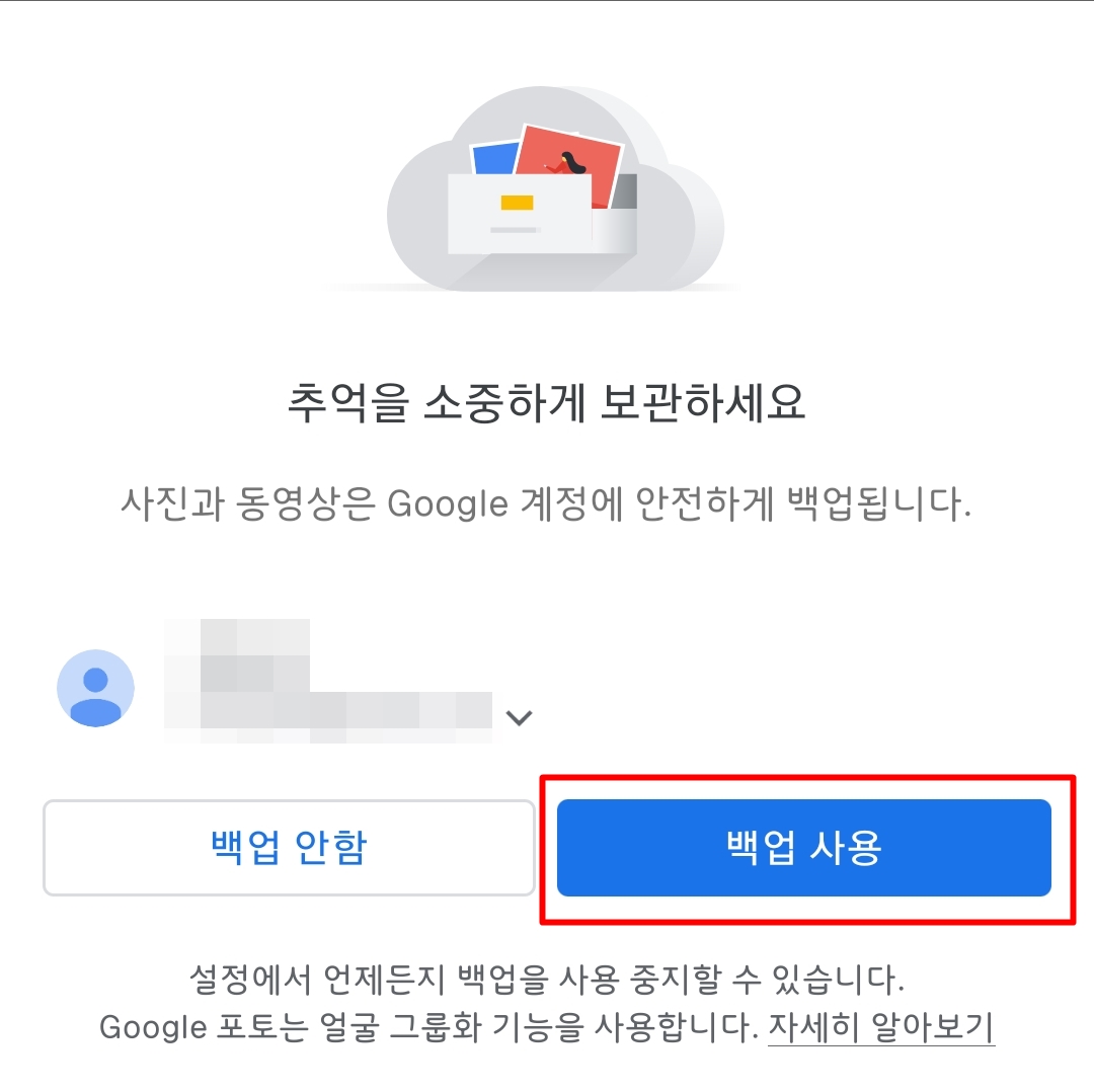 그리고 구글 계정을 선택해서 연결해주면 됩니다. 이제 와이파이가 연결이 되어 있다면 구글 포토로 사진이 백업됩니다.