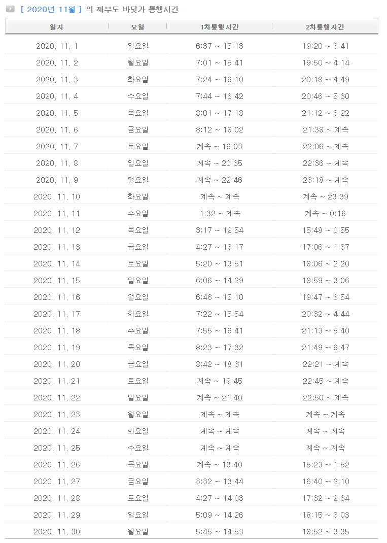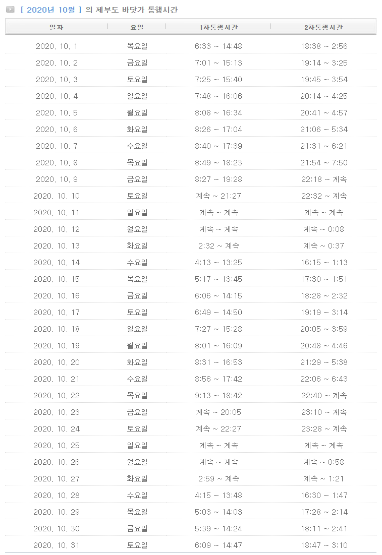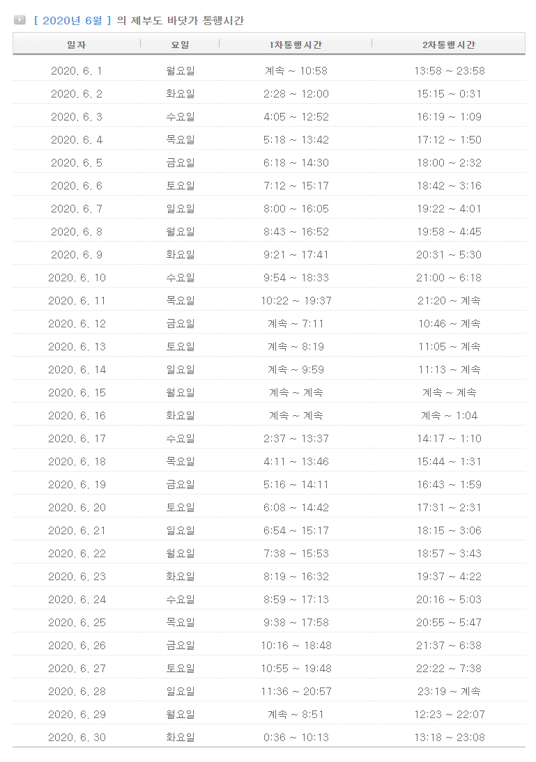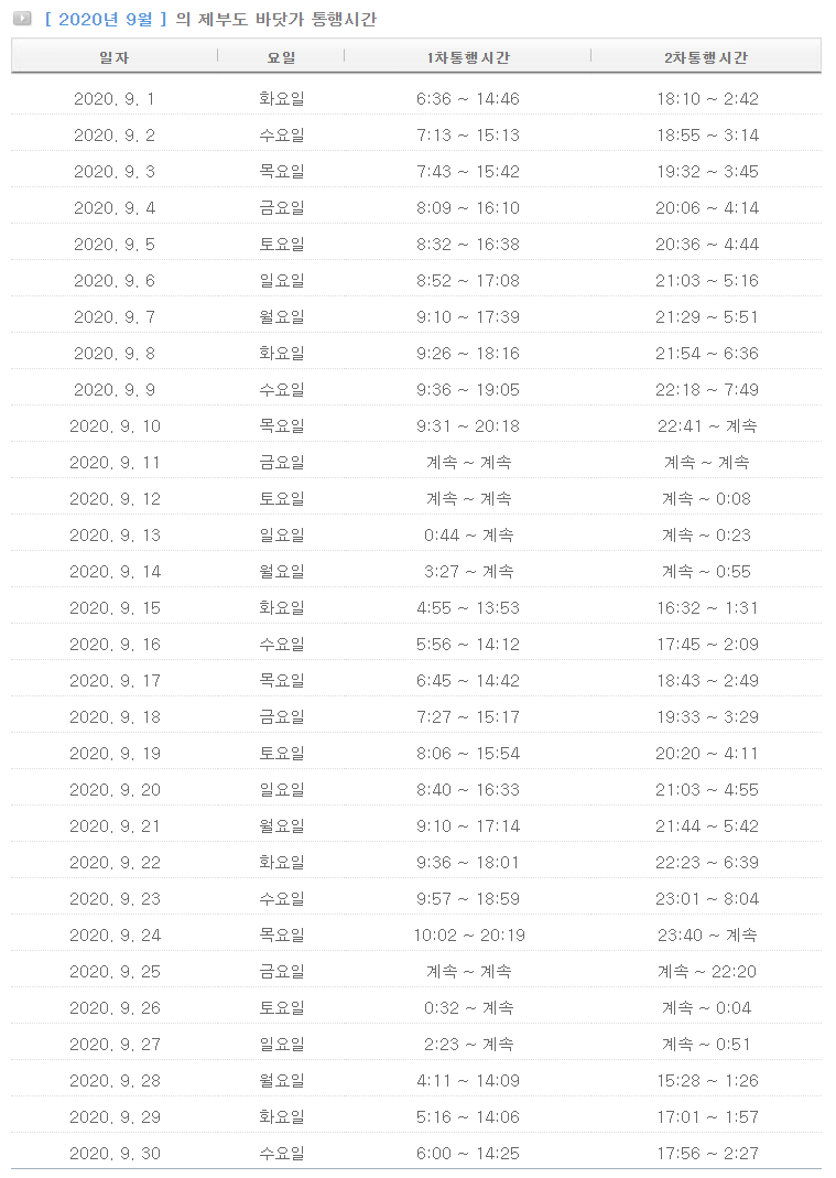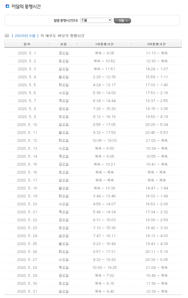 이제 2020년 5월부터 12월까지의 제부도 물때 시간표를 알려드리고 보시는 방법을 설명해 드리겠습니다.
