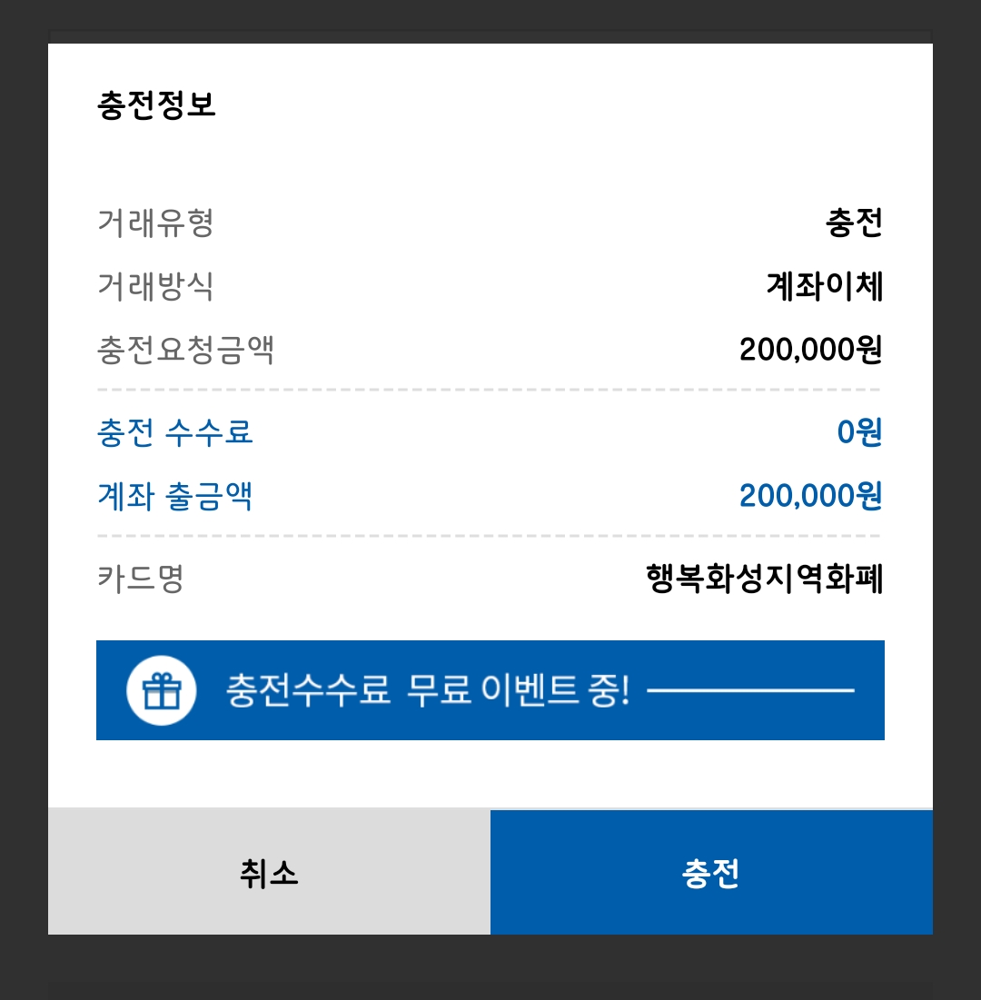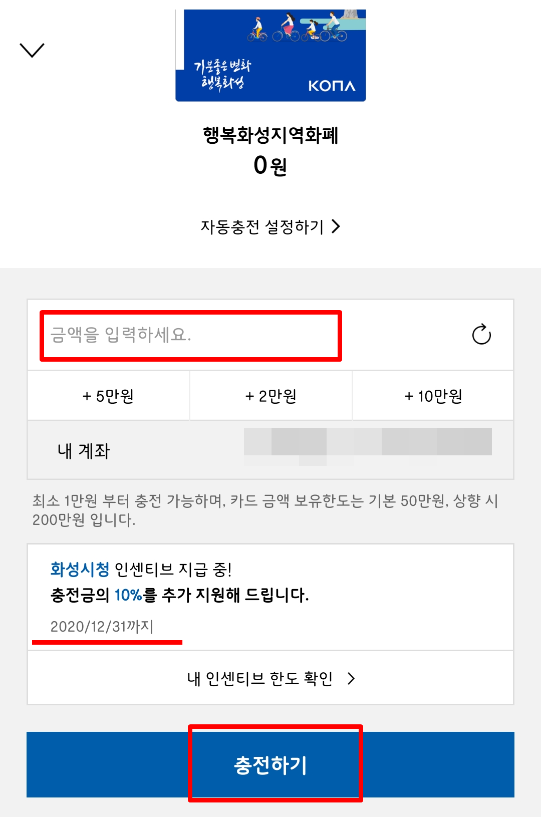 금액은 최소 1만 원부터 50만 원까지 충전 가능합니다. 한도 상향 시 200만 원입니다. 화성시는 인센티브는 2020년 12월 31일까지 10%를 추가 지원해드립니다. 단, 50만 원까지 충전한 금액에 인센티브를 주기 때문에 5만 원입니다.