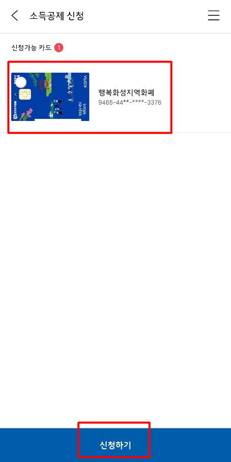 경기지역화폐 앱 메인화면에서 "소득공제 신청하기"를 선택하고 다음 화면에서 "소득공제 신청"을 클릭해서 들어가 줍니다.