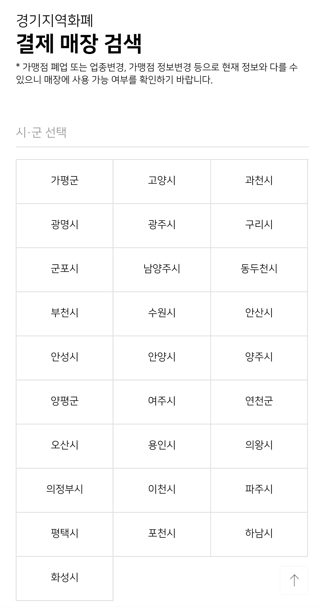경기지역화폐 앱에서 가맹점 찾기를 클릭하면 다음 화면이 나옵니다. 여기서 지역을 선택해서 검색해주면 사용 가능한 곳인지 알 수 있습니다.