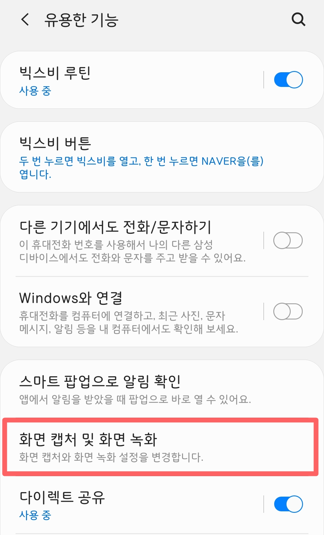 설정으로 들어가서 "유용한 기능"을 클릭합니다. 그리고 "화면 캡처 및 화면 녹화"를 클릭해서 들어가 줍니다.